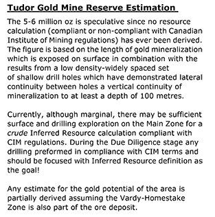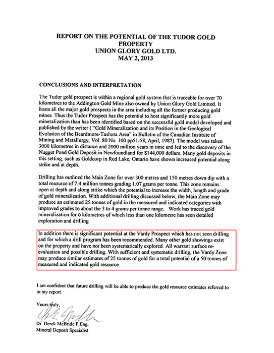 McBride博士的報告:尚未被鉆探過的Vardy勘探區有著非常顯著的潛在黃金儲藏量,因此鉆探項目值得推薦。除此之外,該地區有很多黃金源頭尚未被系統地勘探過。這些潛在黃金礦脈都需要在地面表層進行重新評估甚至鉆探。在充足和系統的鉆探下,Vardy礦區可能產出25噸的黃金。加上主礦區的25公噸黃金,總黃金資源將會達到50公噸>>